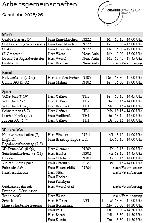 Bei weiteren Fragen wenden Sie sich gerne an die Fachvorsitzenden Frau Rosa Maia (c.rosa-maia@grabbe.nrw.schule) oder Herrn Sprenger (j.sprenger@grabbe.nrw.schule) oder sprechen Sie einen aus dem Kollegenteam einfach an!