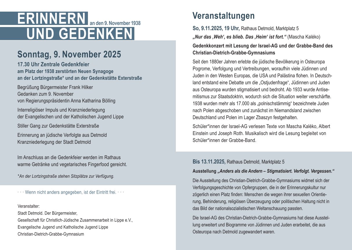 Gemeinsam mit der Stadt Detmold, der Gesellschaft für Christlich-Jüdische Zusammenarbeit in Lippe e.V. und der Evangelischen und Katholischen Jugend Lippe gestalteten Schüler*innen des Grabbe-Gymnasiums die zentrale Gedenkveranstaltung am 9. November in Detmold.